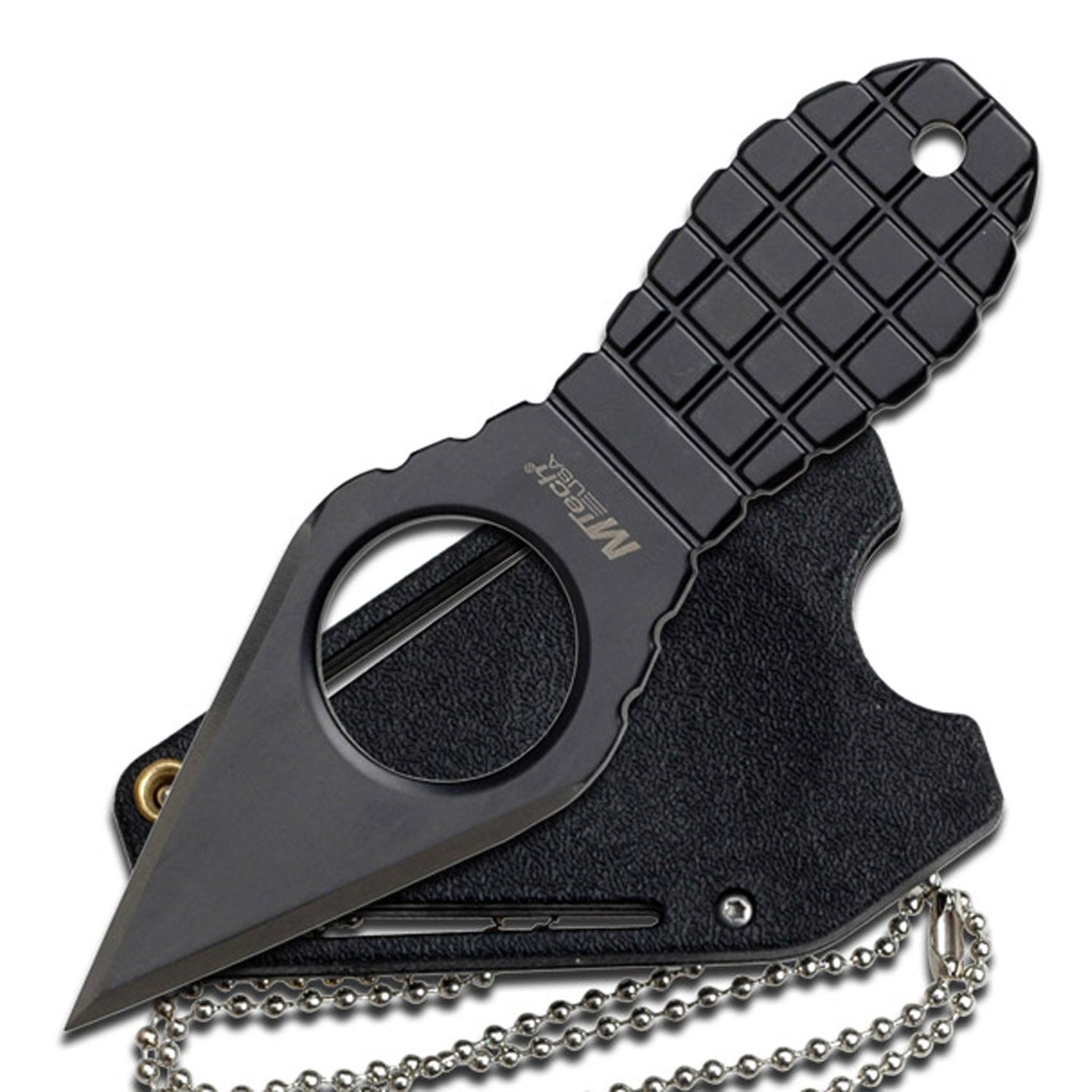 本体真ん中に穴が空いております。 この穴に人差し指 or 中指を入れて、「刺して引く」が使い方。 ネックレスの様に、首から下げられます。 また、ケースの裏側には、ポケットクリップが付いておりますので、パンツやベルトなどに引っ掛ける事が可能。 *ネーミング由来 Grenade = 手榴弾 Neck =首 Knife = ナイフ 持ち手部分が丸く、格子柄になっております。 そう、Grenade(手榴弾)の形なんです。 Blackが良く分かりますよね。